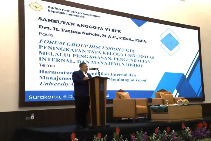Surakarta, 6 Desember 2024 – Anggota VI Badan Pemeriksa Keuangan (BPK) Fathan Subchi menyampaikan pidato kunci dalam Focus Group Discussion bertajuk Harmonisasi Pengendalian Internal dan Manajemen Risiko Dalam Membangun Good University Governance kepada perwakilan Majelis Wali Amanat, Komite Audit, Rektorat, dan civitas academica di lingkungan Universitas Sebelas Maret.