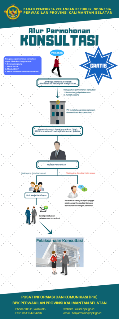 Selamat datang di layanan pengaduan Pusat Informasi dan Komunikasi (PIK) BPK Perwakilan Provinsi Kalimantan Selatan. Untuk melihat alur permohonan konsultasi, silakan klik disini.